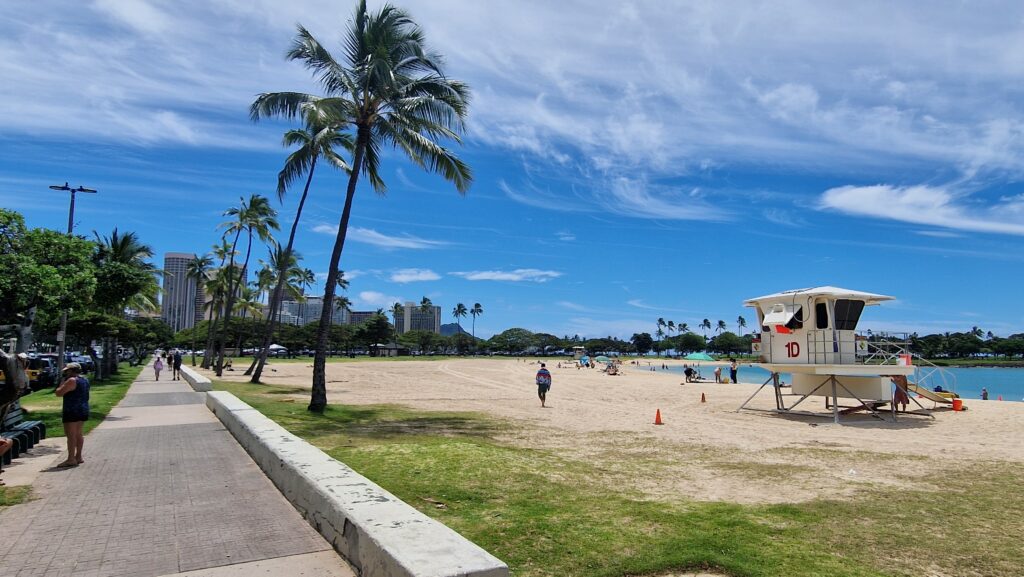 Hawaii has interesting history and folklore. Mild climate, tropical flowers and trees. And of course fantastic beaches. First on our route was modest Moana Beach – life guard is prasent, but no crowd at all: