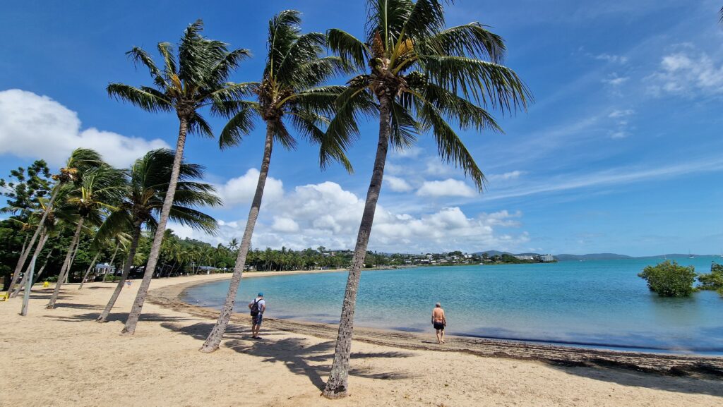 We disembarked in the marina (yes, they offer maps, but no wi-fi connection here). City bus (5 AUD fee) can take you to the settlement. But it is walking distance. On the way you will see souvenir market with clothes and plastic products. Nothing special… The palm- fringed city beach is nearby. It is hot…. Thanks God drinking water dispensers are around.