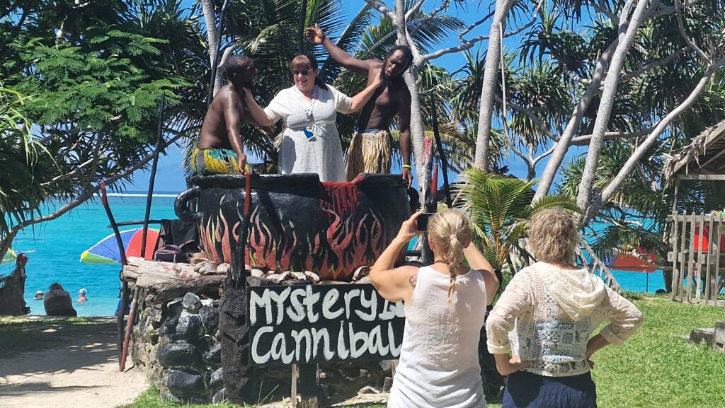 Lovely song were performed by local choirs during my stay on Mystery. Massages and hairdressing were offered too. Funny picture in the canibal’s big pot cost 5 AUD.